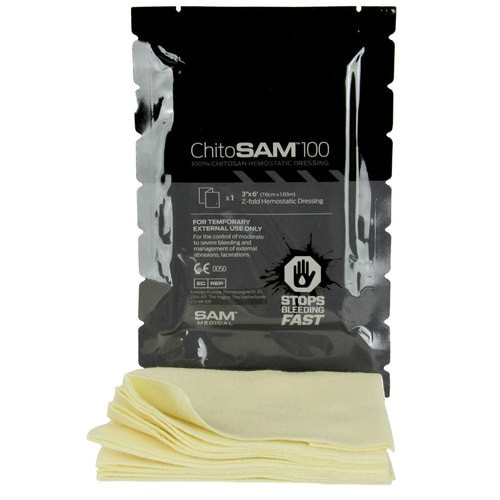 Гемостатичний бинт ChitoSAM 100 — це високоефективна хітозанова марля від всесвітньовідомої компанії SAM Medical. Бинт спеціально розроблений для швидкої та надійної зупинки кровотеч різного походження. Виготовлений з нетканого хітозану, отриманого з панцирів ракоподібних, цей бинт забезпечує ефективний гемостаз незалежно від природних процесів згортання крові в організмі.